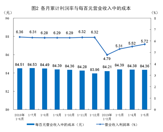 1 — 5 月份,规模以上工业企业每百元营业收入中的成本为 84.36 元,同比增加 0.21 元;每百元营业收入中的费用为 8.64 元,同比增加 0.21 元。