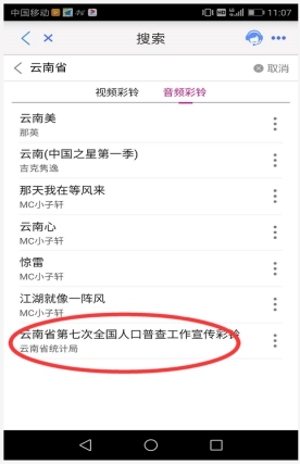“云南省第七次全国人口普查主题彩铃”进行搜索。点击右侧“…”提示符,在弹出的选项中选择“彩铃”,再点击“确定订购彩铃”即可设置为手机铃音。