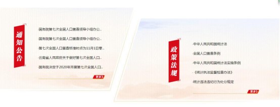 “通知公告”和“政策法规”栏目将有关人口普查的各项通知公告和法律法规知识进行展示,便于普查人员和普查对象及时掌握重要信息,使各级普查机构、普查工作人员依法开展第七次全国人口普查工作,使广大普查对象依法履行义务,积极配合人口普查工作,确保普查工作的高效开展。