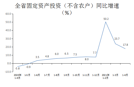 1-4月,全省固定资产投资同比增长17.8%,比2019年1-4月增长13.3%,两年平均增速为6.4%。其中,民间投资增长29.2%。