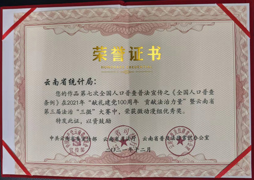 2021年12月,中共云南省委宣传部、省司法厅、省普及法律常识办公室向省统计局颁发荣誉证书,表彰省统计局制作的第七次全国人口普查普法宣传之《全国人口普查条例》微动漫视频,在2021年“献礼建党100周年 贡献法治力量”暨云南省第三届法治“三微”大赛中,荣获微动漫组优秀奖。